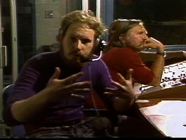 Series Producer and Host Jim Heddle in the control room with filmmaker Stan VanDerBeek during production of the series in 1976.